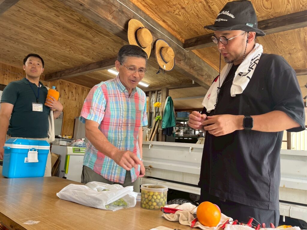 「4月から5月に出る春先のアスパラガスがパワー全快で糖度も高く、是非、加藤シェフには春先のアスパラガスを食べていただきたい!8月の夏のアスパラガスは、春先より糖度は低くなるから、そのことをわかって料理に活かしてね。」と加藤シェフにアスパラガスを託しつつ、実は、アスパラガス以外にも、加藤シェフに紹介するよ!と、自家製オリーブオイルの塩漬け、アーモンドの木等など、大渡さんのおすすめ食材をぐるりと視察させていただきました。