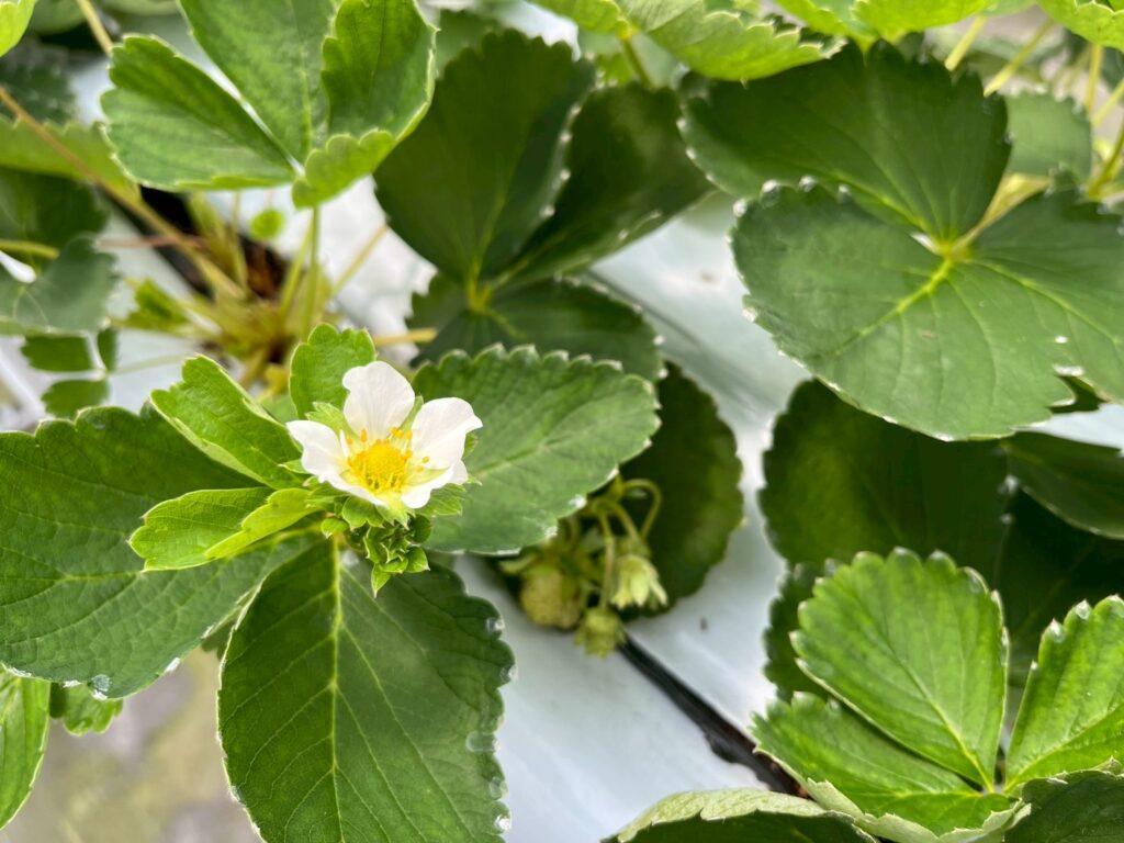 訪ねた日は、いちごの花が開花しているタイミング。加藤シェフは、受粉活動に期待されているミツバチたちも夏バテ気味なんじゃないかな?と動きが気になる様子でした。