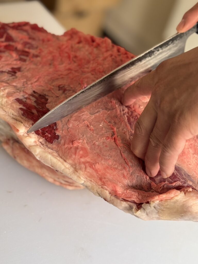 ※「飯舘村の夏」当日は提供したのは、経産牛(部位:ザブトン)。「食材探訪を通して村の方々と出会い、つくり手の物語を感じることができました。さて、これをどんなコースに仕上げようかな!」と加藤シェフ。