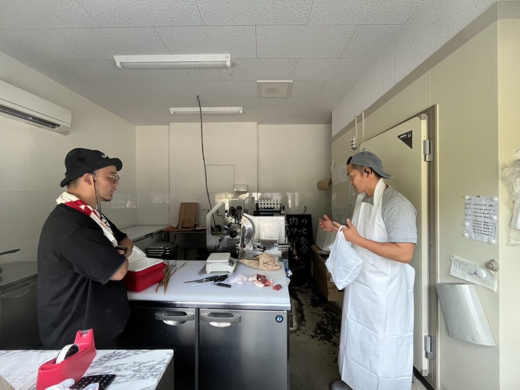 「飯舘村に来たからには、肉のゆーとぴあさんの山田さんに会わないとね」と加藤シェフ。