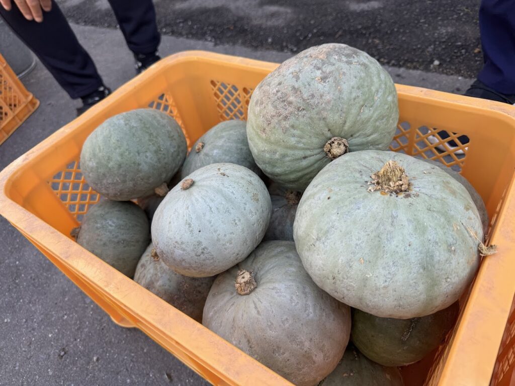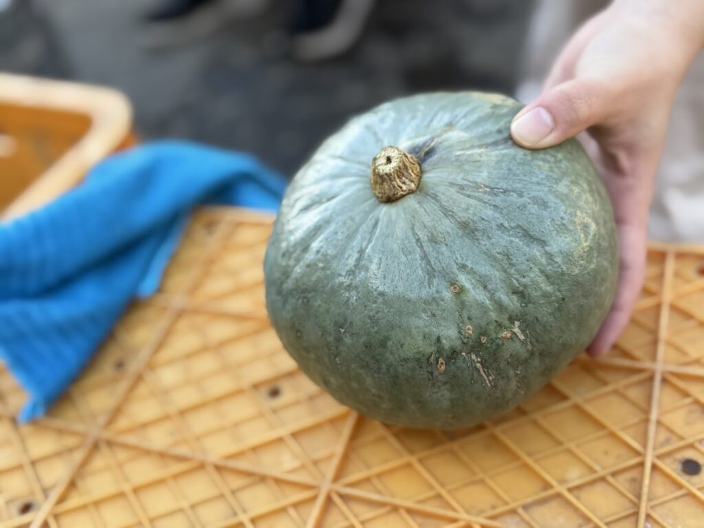 さらに、「乾物率30%超えの雪っ娘かぼちゃは、「極上」もの。甘みがあってホクホクとしっとり感がよりつよく、ほんとうに、素晴らしいかぼちゃに出会えて、取扱いさせていただけることがとっても嬉しい」と猪岡シェフ。猪岡シェフには、朝早くから検品作業を3ケース分体験いただきました。
