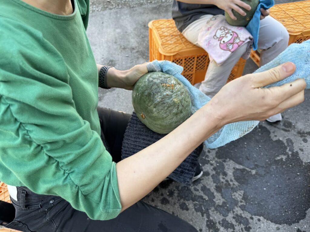 ★上記写真 いいたて雪っ娘かぼちゃの磨き作業(雪っ娘かぼちゃの表面についている土汚れを落とし)