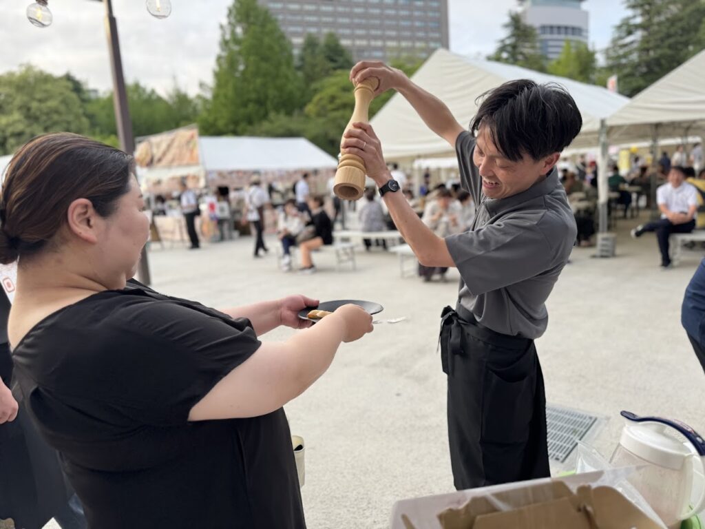 飯舘産黒毛和牛の「スペッツアティーノ」はコンスタントに注文が入り、仕上げのブラックペッパー係が大活躍!