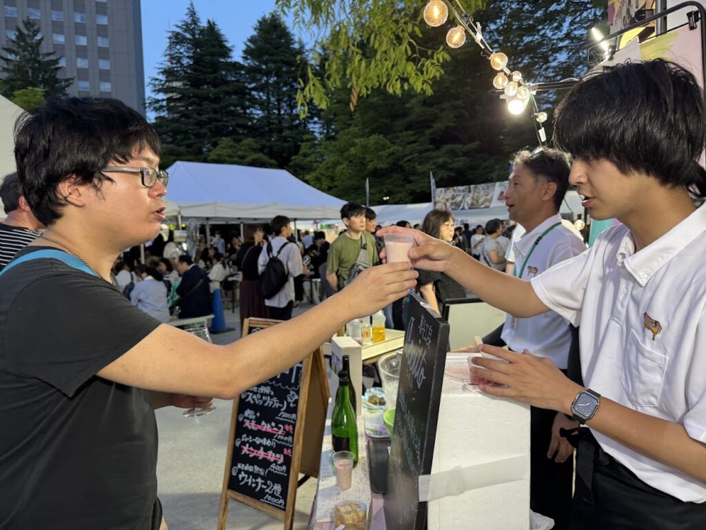 ノンアルコール「あぶくまもちのいちご甘酒」は、ワインの合間に飲まれる方や出展者の方々から「熱中症対策に!」とご注文いただき「しみわたる美味しさ~疲労回復する~」ととっても喜んでいただけました。「チームいいたて」2日目(夜の部)メンバー 写真左から 巻野凌さん、渡部誉典さん