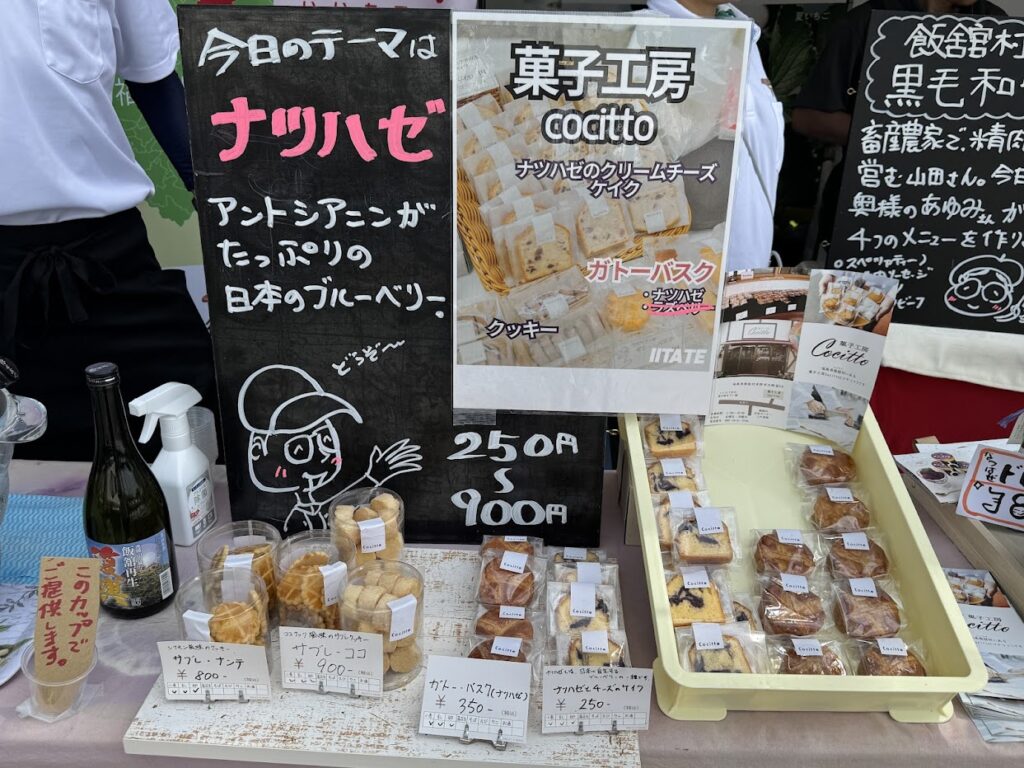 3日目は、菓子工房codittoさんが参戦! 村産「ナツハゼ」をテーマにした焼菓子、ガトーバスクやケイクを中心に取りそろえ、2日目から販売している、ニコニコ菅野農園さんのナツハゼ商品とともに、ご紹介しました。