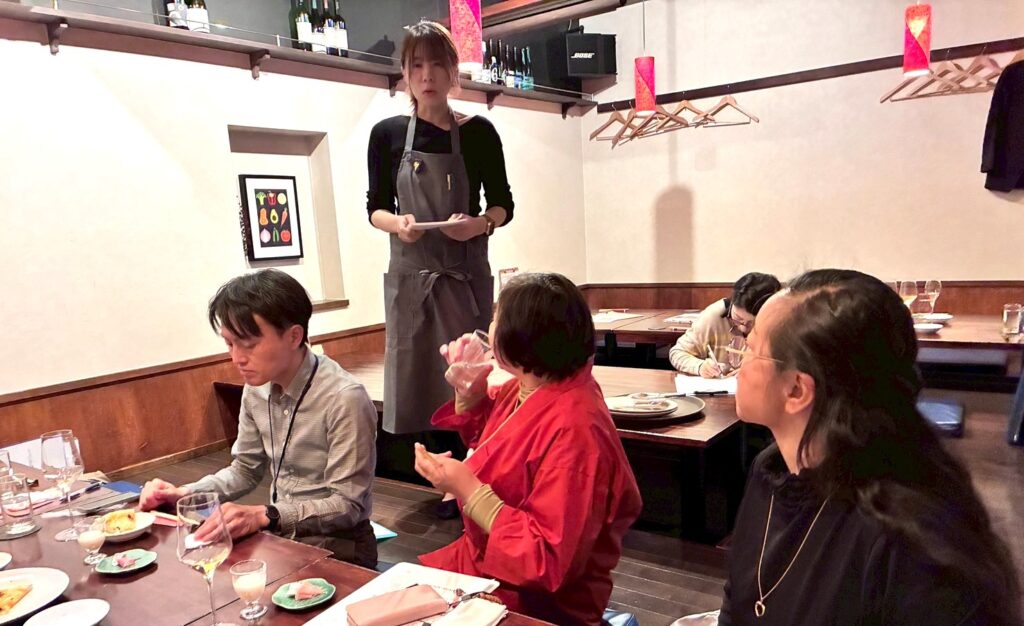 その後、メニュー開発が進み、使用する食材の生産者様に事前に食べていただき、お店のメニューとして提供していく方向性を確認するための検討会を開催しました。気軽にワインも楽しんでほしい!と店主の奥様でもあり、ワインソムリエの大久保美幸さんにお力添えいただき、メニューとのペアリングにも挑戦しました。