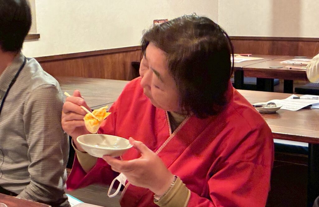 「おいしいごちそう、ありがとうございました。普段食べれないものばかりで、とてもおいしかったです。材料の組合わせで、いろんな料理ができるんだな、と思いました。どぶろくも使っていただき、ありがとうございます。すごくうれしかったです。(現在、たわわ店舗では、おすすめで提供している)これからも、心を込めて作っていきたいと思いますのでよろしくお願いします。今のどぶろくは辛口なんですけど、ちょっとまた、フレーバードをいろいろ考えて、女性にあうように甘口にしたり、考えています。 日本酒にもいろいろあるので、酵母を変えてみたりとか米を変えたりすると変わるみたいなんですよ。これから、研究しながらなんですけど、よろしくお願いします。」試食検討会を終えて