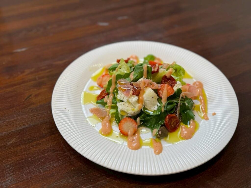 野菜とセミドライトマトとモッツァレラチーズ、くるみをすずあかねいちごドレッシングとともにいただくと、食感が楽しくまた、口内調理で一体化した美味しさ。