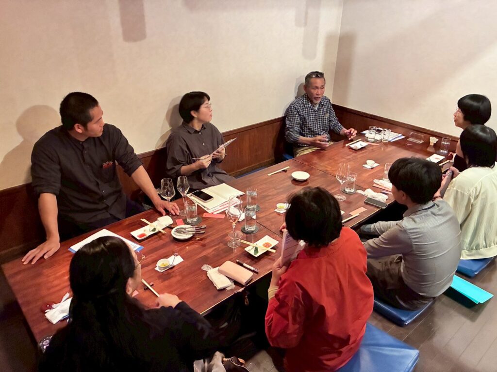 その後、メニュー開発が進み、使用する食材の生産者様に事前に食べていただき、お店のメニューとして提供していく方向性を確認するための検討会を開催しました。気軽にワインも楽しんでほしい!と店主の奥様でもあり、ワインソムリエの大久保美幸さんにお力添えいただき、メニューとのペアリングにも挑戦しました。