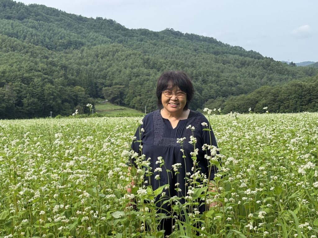 生産者の長谷川花子さんを蕎麦畑でパチリ。あたり一面蕎麦畑、どこまでも続く圧巻の蕎麦の花でした。いいたてベーグル、リピーター増えてます