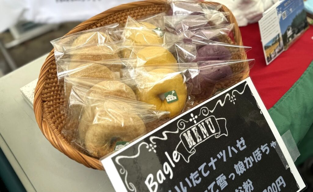 村産のナツハゼ、雪っ娘かぼちゃ、きな粉を生地に練り込んでいて、素材の味を楽しめるもっちりしっとりベーグルが特徴です。今回は、”いいたて蕎麦おやき”と”いいたてベーグル”の両方を同日販売に挑戦しました。