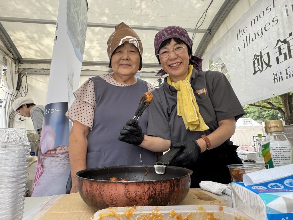 郷土料理の味噌じゃがは、現地で仕上げの加熱調理を行って、\できたて/をご用意しました。飯舘村の出店最終日の祝日は、お子様連れのご家族が多く、昼食の時間帯は大賑わい。