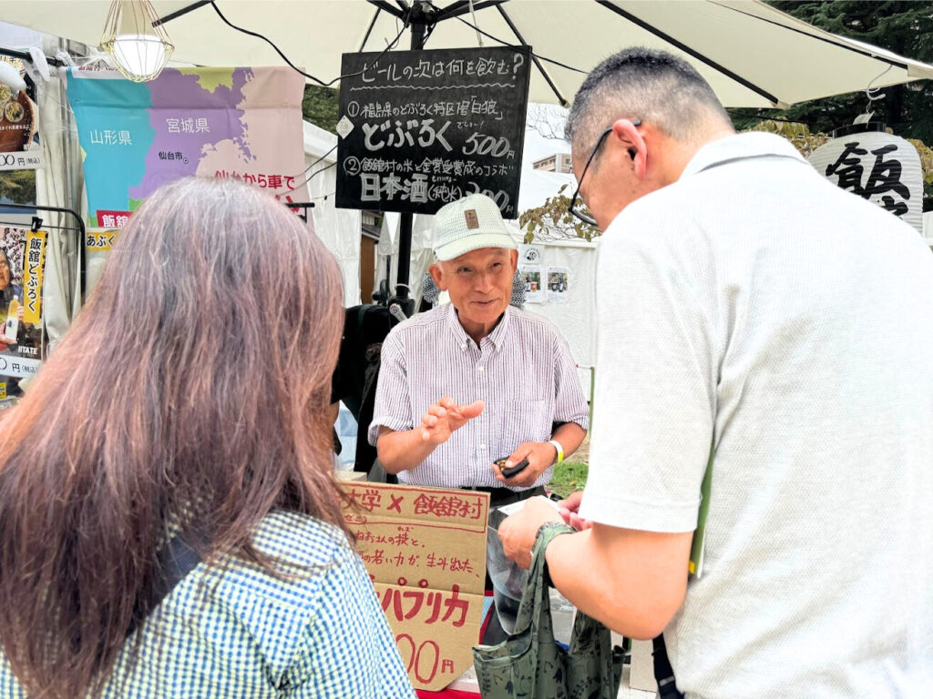生産者のお二人が村外イベントでお揃いになるのは貴重なこと。「生産者さんと直接お話ができるのは贅沢!え?本当につくられているご本人なんですか??」と質問攻めにあう千榮子さんに、宗夫さんが「本当に、どぶろくをつくっているご本人ですよ!」とご紹介。(写真左)