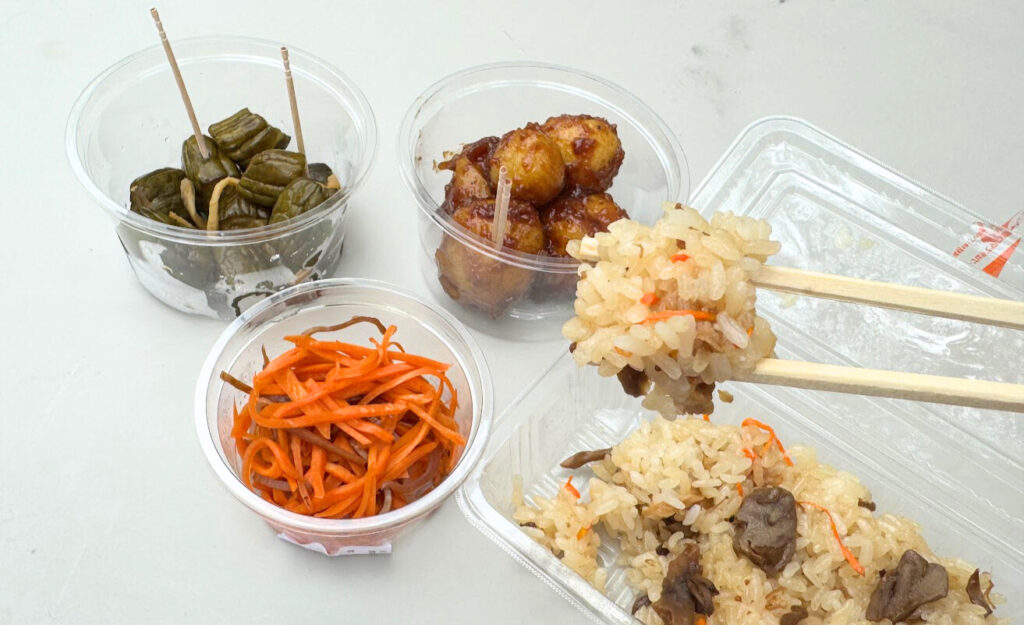 あぶくまもちの舞茸おこわ、イカ人参、味噌じゃが、ピリ辛胡瓜漬け