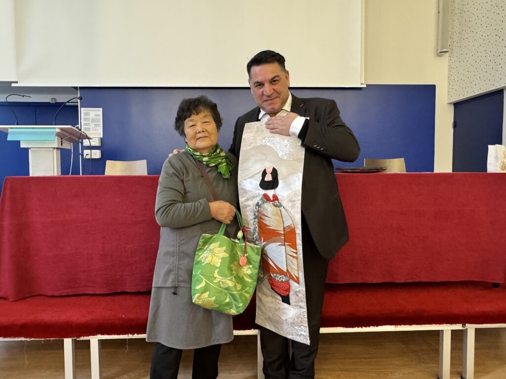 在仏日本人の皆様、「日本文化会館」、「JETROパリ」、「福島県人会」、「在仏日本人会」の方々にご出席賜り、飯舘村の今を知っていただく情報交流も行われました。ギン校長先生には、千榮子さんお手製のお土産を進呈しました。