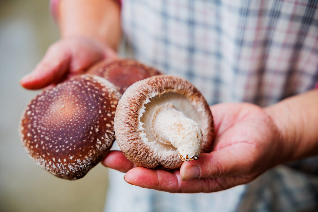 写真(左)、髙野さんが生産したジャンボ椎茸とベーコンエッグとワインのペアリングを試しているところ。