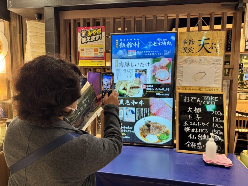 デジタルサイネージで、飯舘村フェアメニューが表示されていて、ご主人と一緒の写真が大きく表示されているのをみて、髙野笑子さん、思わず写真撮影。
