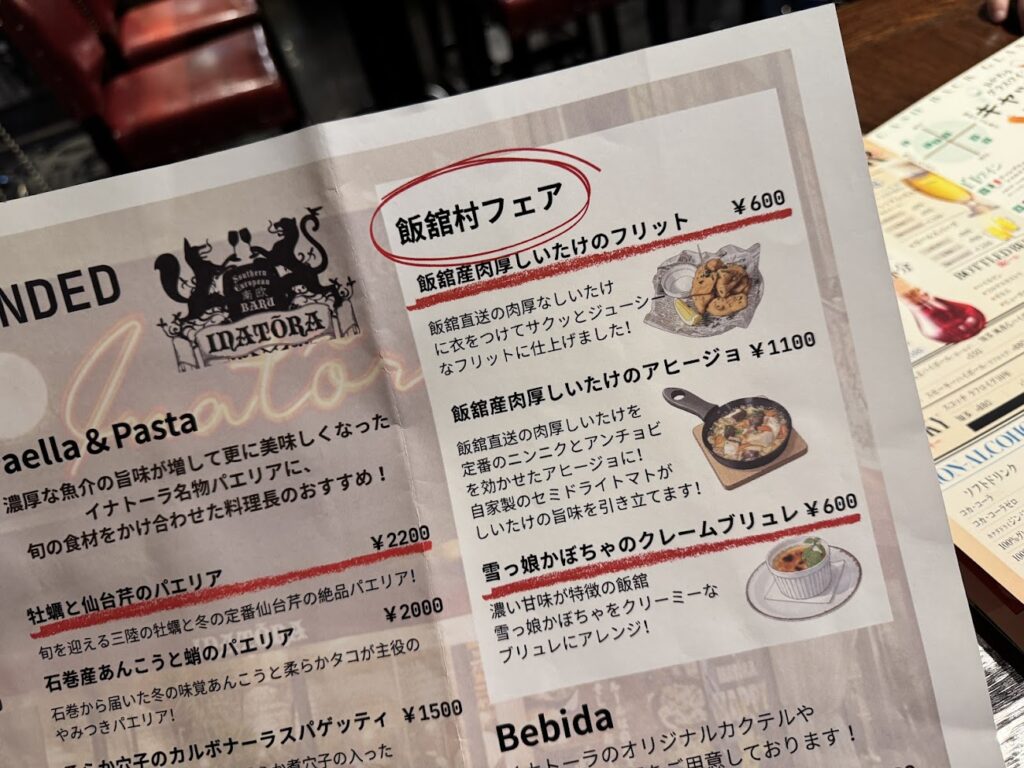 福島県産飯舘牛スジ肉と雪っ娘かぼちゃのトマトクリームスパゲティ、福島県産飯舘村のジャンボ椎茸のクリームリゾット、福島県産飯舘村のジャンボ椎茸とベーコンエッグのアルフォルノには、おすすめワインとのペアリングのご提案も!メニューを見るのがワクワクしました。