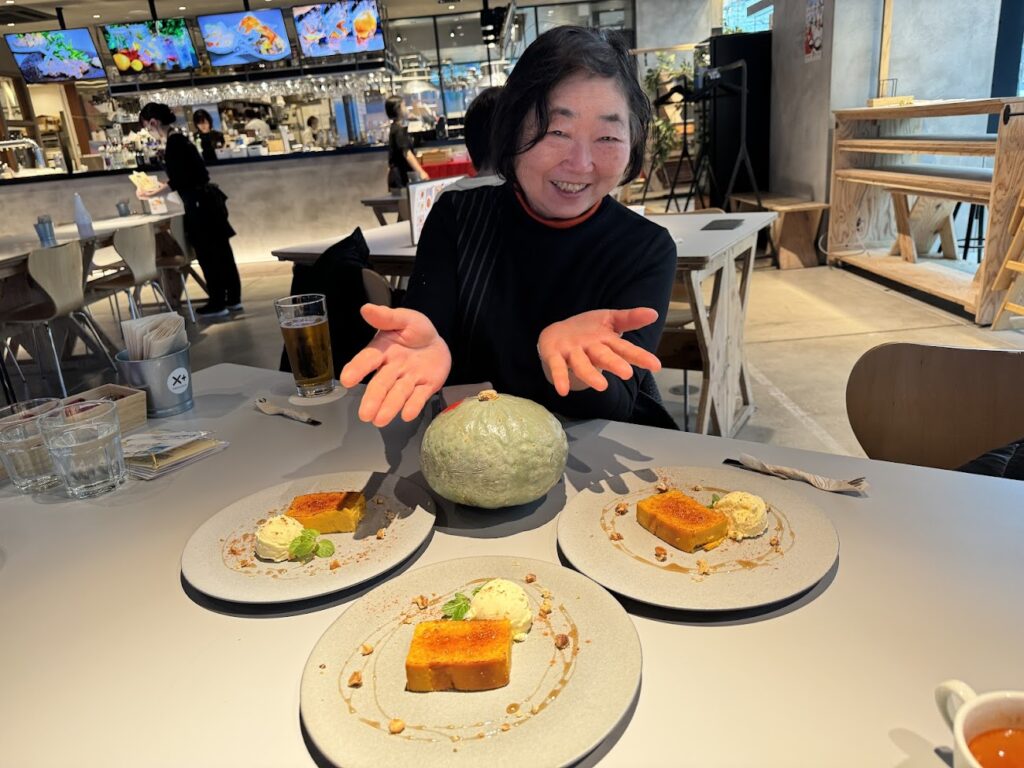 濃厚な雪っ娘かぼちゃを滑らかに仕上げ、表面をパリパリに焼き上げた食感の違いも人気の理由かな、とスタッフさん。生産者のとみ子さんが、お店訪問を行い、ご挨拶を行いました。