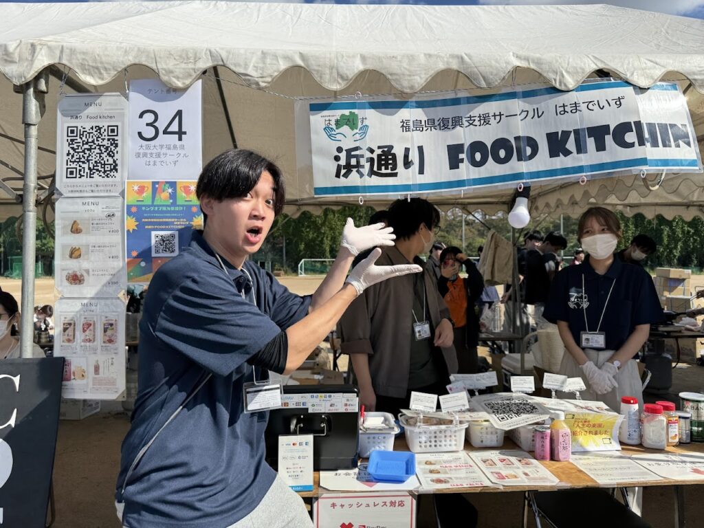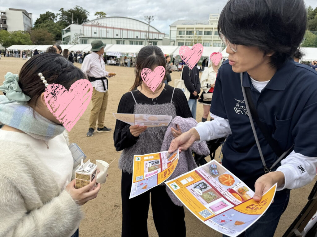 模擬店と館内教室を両方まわると、福島の桃100%ストレートジュース「桃の恵み」1本もらえる!という、特別企画付メニュー表&スタンプラリー台紙をお配りし、立ち寄ってもらえるように、とお声かけも。それぞれの個性が面白い!はまでいずメンバー。模擬店と教室に立ち寄ってもらえるよう 店頭&道ばたでの声かけと、地道に取組んでいる様子。