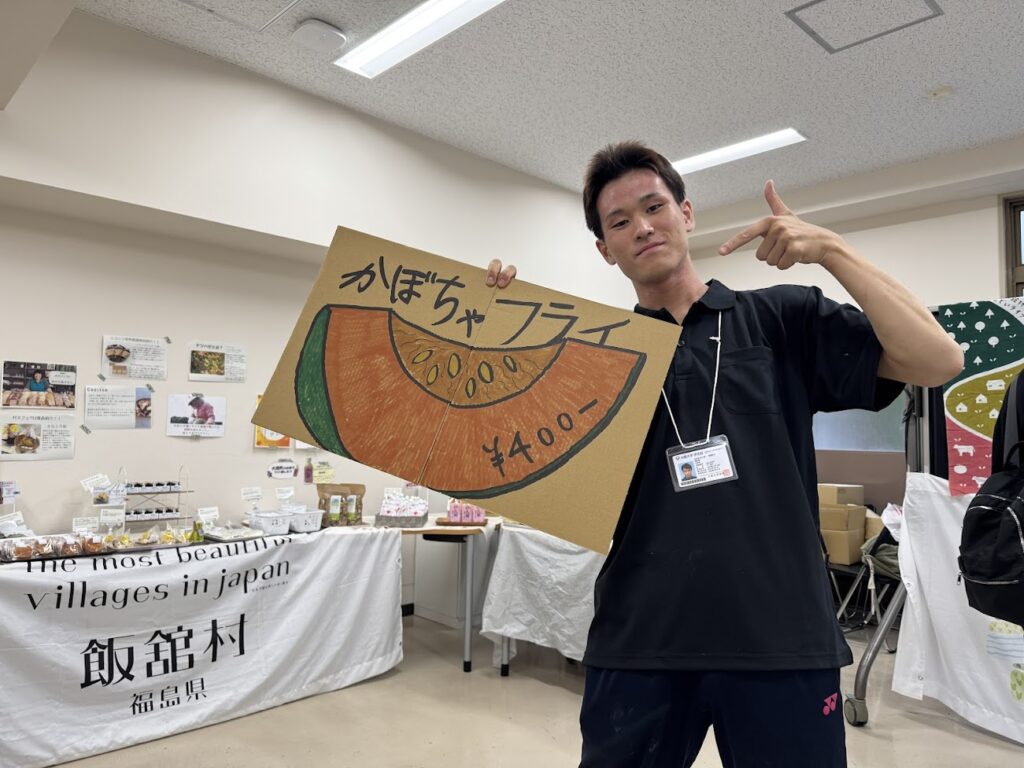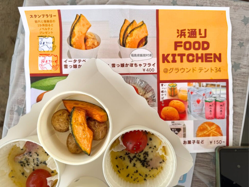 模擬店は、「浜通り FOOD KITCHEN」とネーミングし、飯舘村産雪っ娘かぼちゃとイータテベイクのフライ、大熊町産のミニトマトを使ったベーコンチーズを中心に、