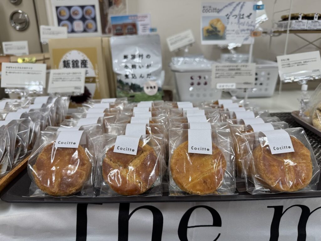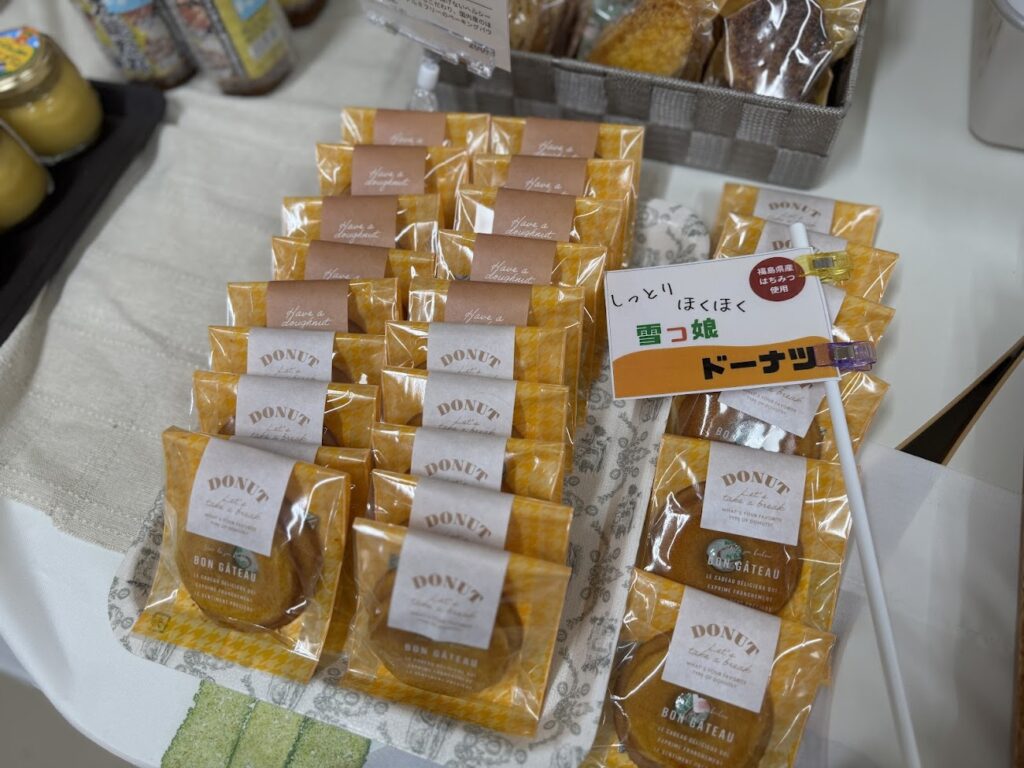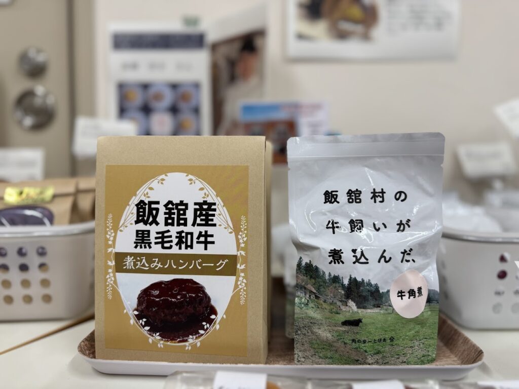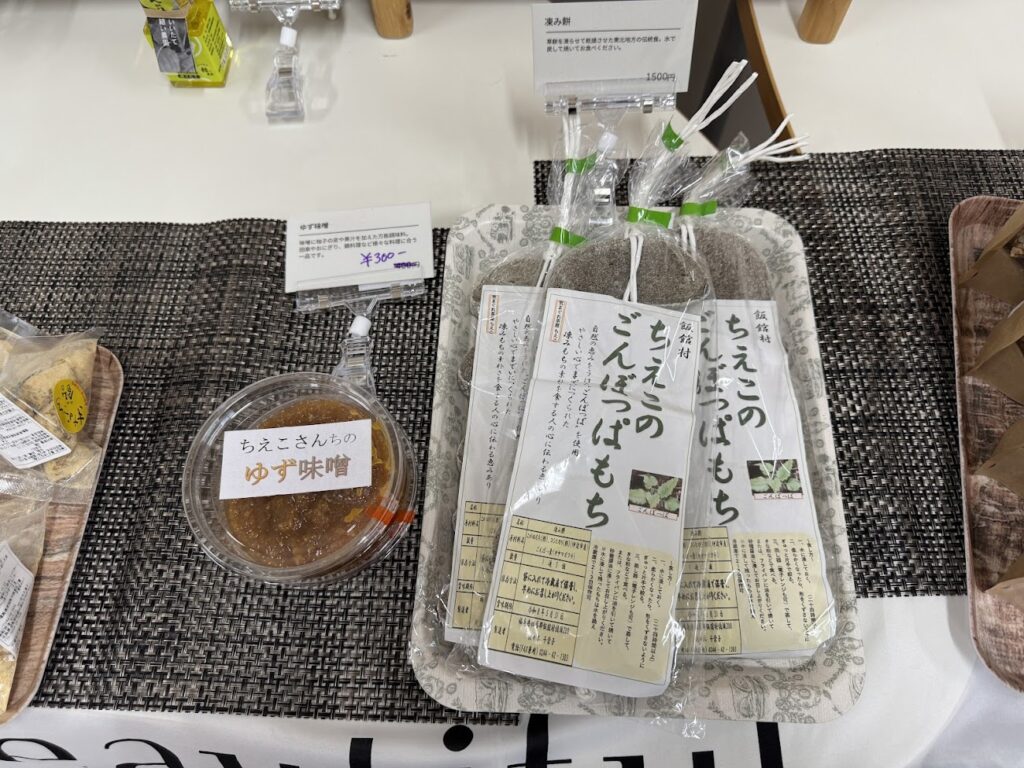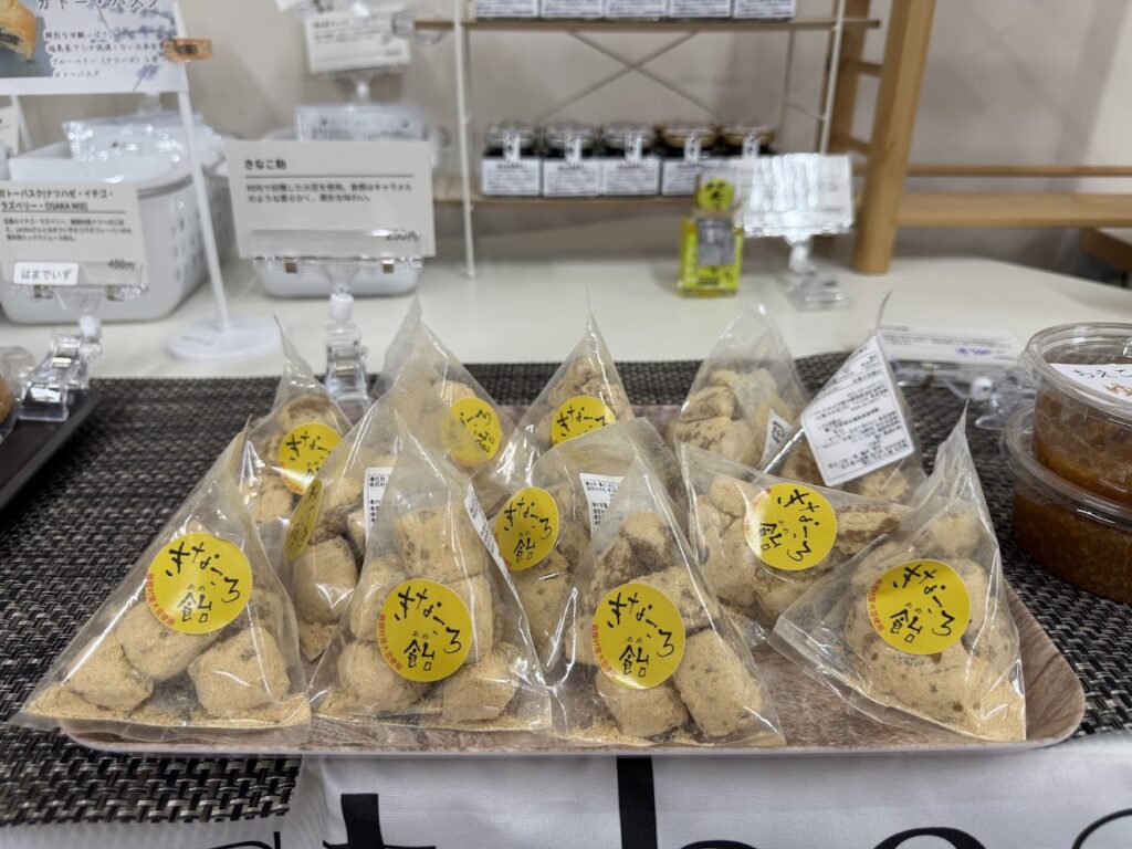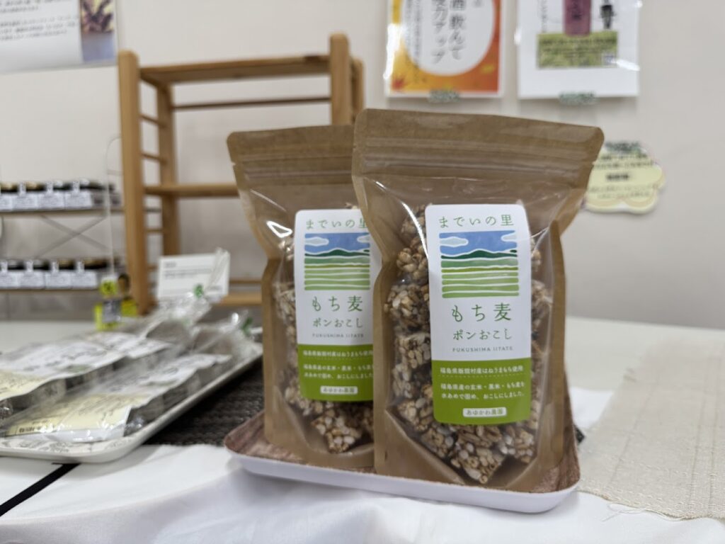 飯舘村の十三営農区で栽培された大豆をきな粉をたっぷり使用した、昔懐かしの飴。その他にも、いいたて村の道の駅までい館で購入できる産品やグッツを、紹介を添えて販売しました。