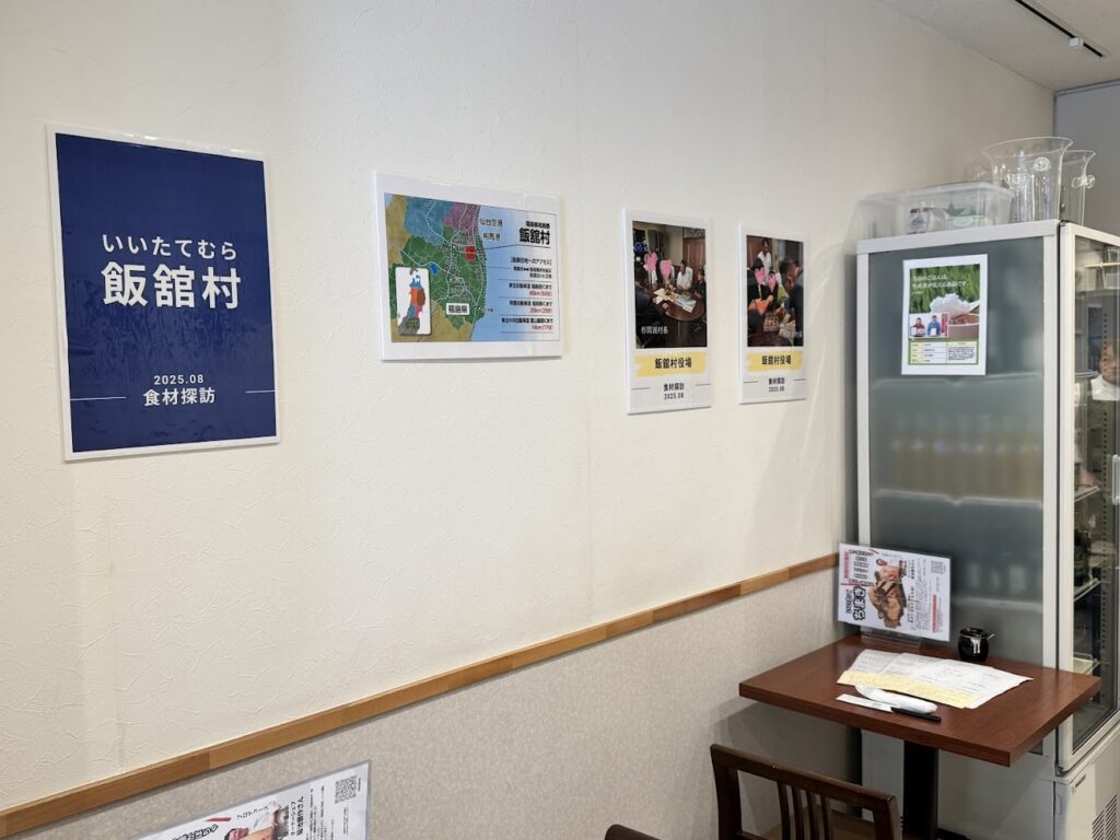 店内、菊池シェフが飯舘村を訪問した際の食材探訪時と生産者さんのお写真を展示、各テーブルに観光パンフレットもご用意しました。