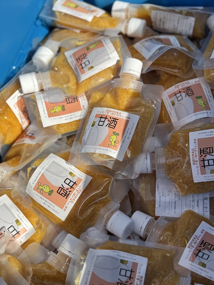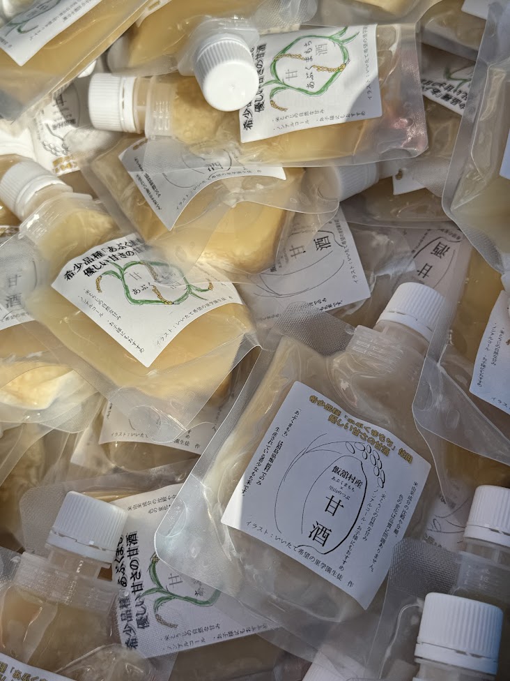 ・あぶくまもち甘酒甘酒は、飯舘村産「里山のつぶ」を使用。田植えから稲刈り、そしてパッケージデザインまで、「いいたて希望の里学園」の生徒さんが携わった、想いのこもった商品です。