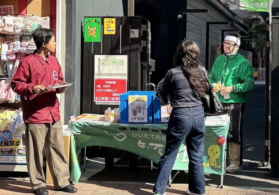 「飲んで味わってもらえれば、麹の粒々感とお米そのものの優しい甘さがわかっていただけると思います。」と神代副駅長。東大むら塾の学生さんも、甘酒飲み比べの試飲だけでなく、購入いただいたお客様へ飯舘村の観光パンフレットをお渡しサポートを行っていました。