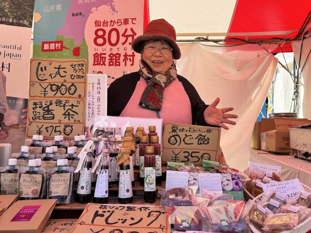 抗酸化作用があるポリフェノールがブルーベリーの約6倍あることや熱に強い特性があることに着目し、商品開発に長年取組んでいます。今回、食べて応援しようin仙台2026の特別企画 福島県食の復興座談会 に菅野クニさんが登壇することを受けて、飯舘村は、”飯舘村のナツハゼ商品シリーズ”を集めた特別ブースをご用意。