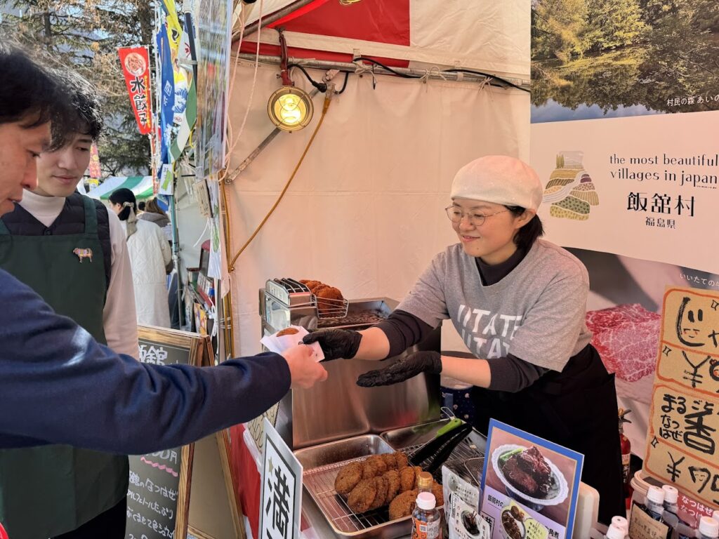 昨年食べたお客様が、飯舘村が出店するという情報を見ていらした方、「飯舘村の牛メンチカツがおいしいとうわさを聞いて」とお声かけくださる方がいて、イベント開始時間からコンスタントに売れていき、初日は約140個販売しました。現在は、いいたて村の道の駅までい館で常設販売しておりますので、気になる方はぜひ!