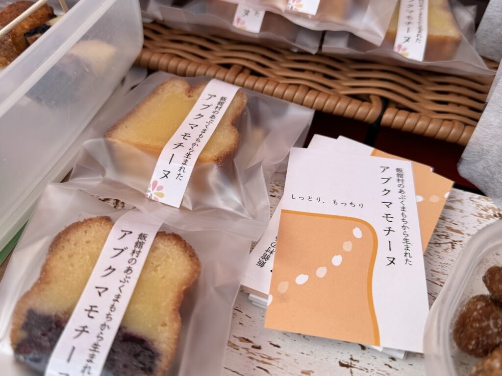 「アブクマモチーヌ」は、生地に「あぶくまもち」のもち粉が使用されており、やさしい甘さともっちり感を楽しめる焼菓子です。プレーンとナツハゼ味を今回ご用意しました。