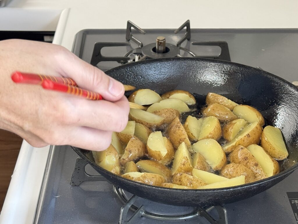 そこに、フライド&ローストした村産じゃがいもと椎茸、薬味として、いいたて結い農園さんの荏胡麻スパイスとワサビが添えられた一皿がご用意されました。調理者は、2024年秋から、飯舘村のアンテナショップと思っていただけるように取組んでいる、旬鮮香房たわわ(福島市)店主の大久保聡さん(飯舘村出身)。