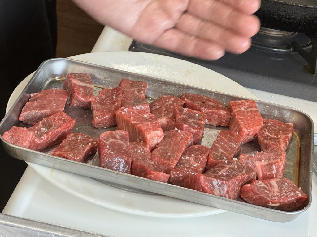 ②村産品をふんだんに使った、「いいたてちまき」飯舘産黒毛和牛 サイコロステーキ