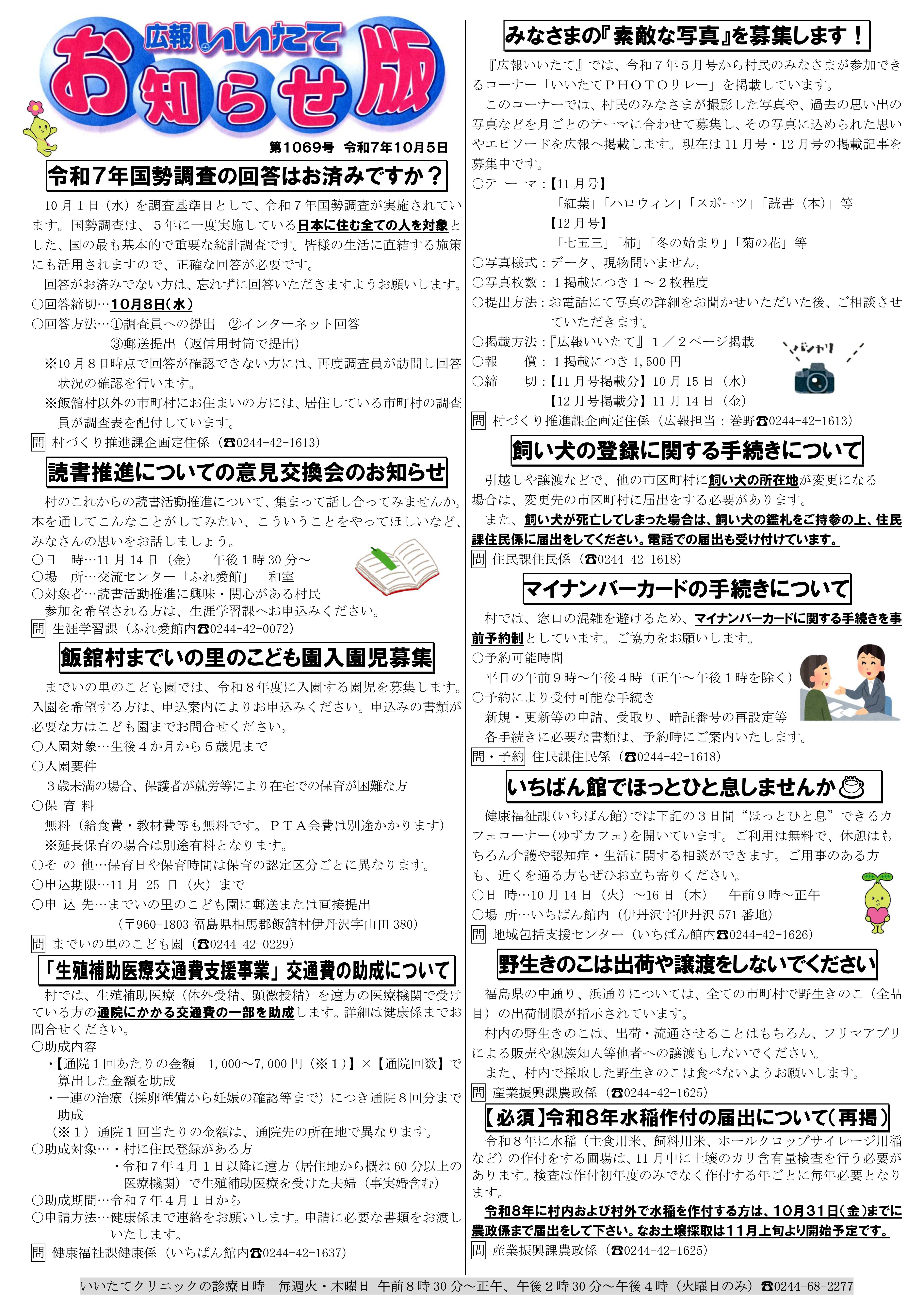 ●令和7年国勢調査の回答はお済みですか? ●読書推進についての意見交換会のお知らせ ●飯舘村までいの里のこども園入園児募集