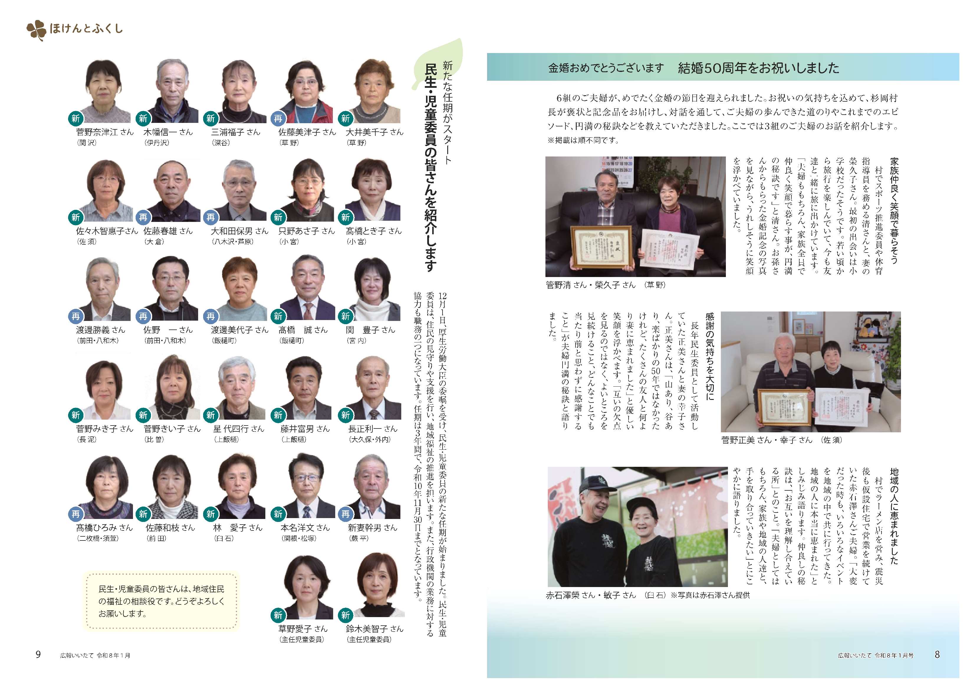 8~9ページ お知らせ「金婚おめでとうございます」/ほけんとふくし「民生・児童委員」