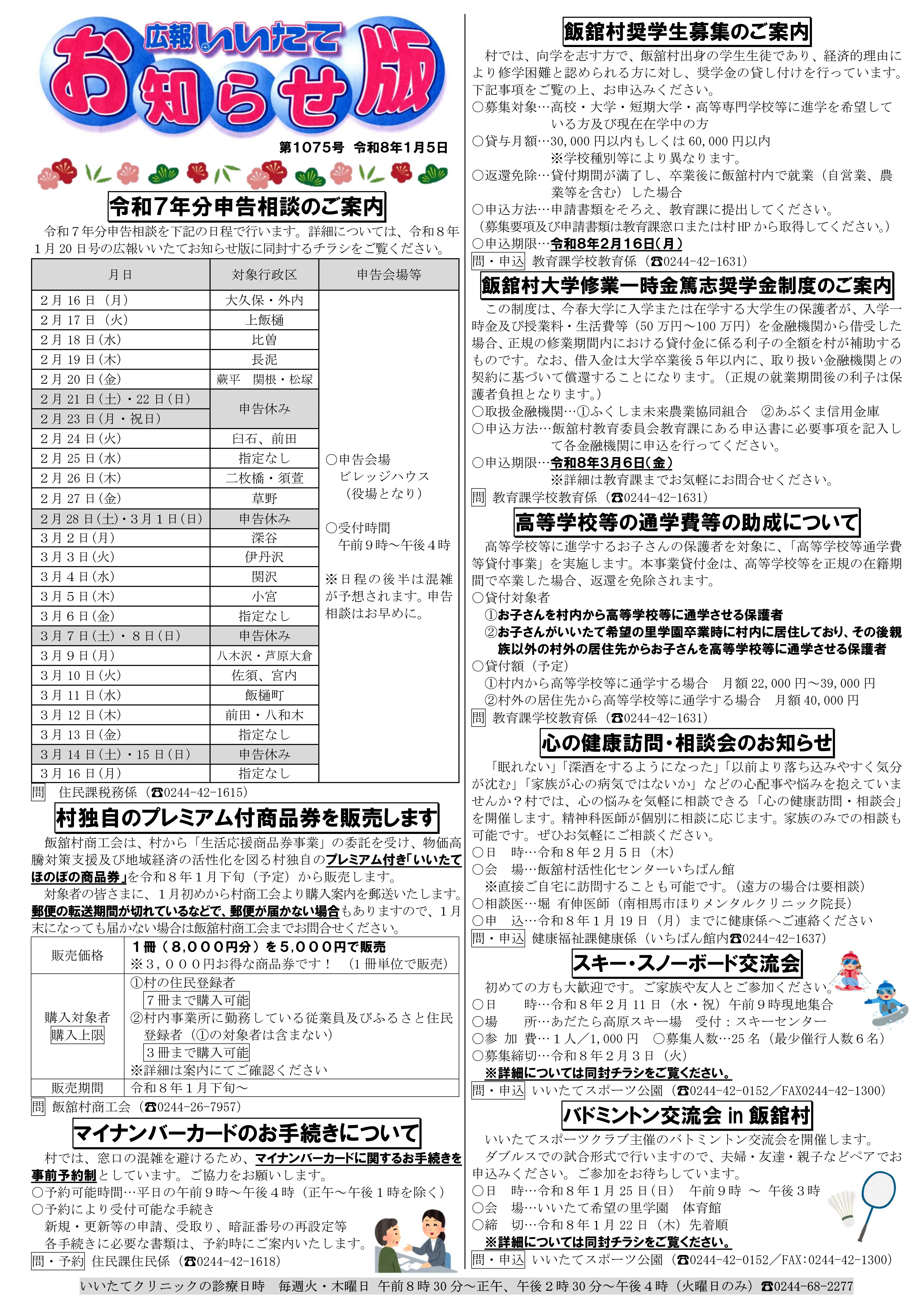 ●令和7年分申告相談のご案内 ●村独自のプレミアム付商品券を販売します ●マイナンバーカードのお手続きについて