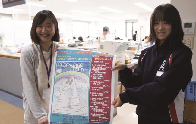 代表生徒(右)が届けてくれたポスター。庁内に掲示しました